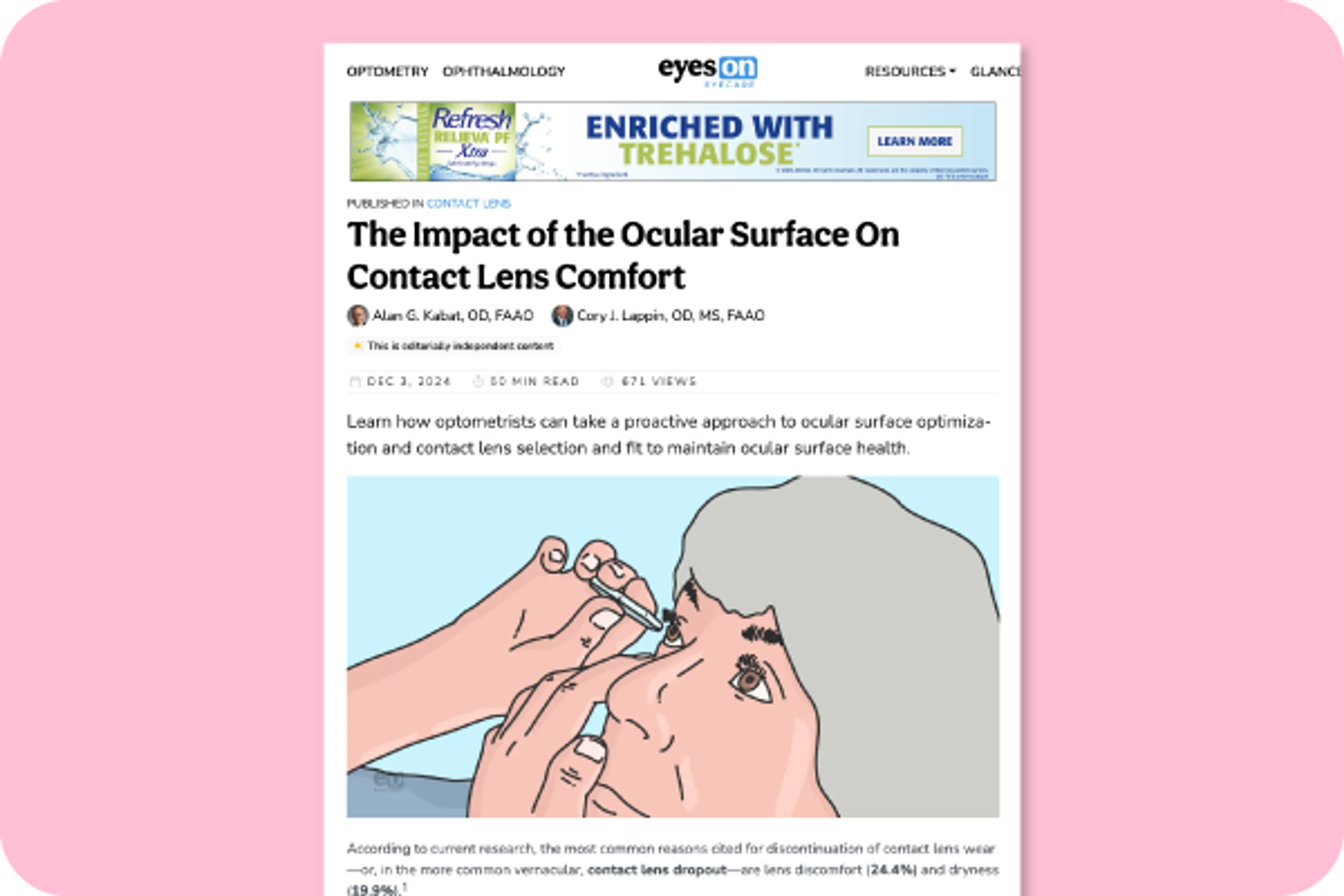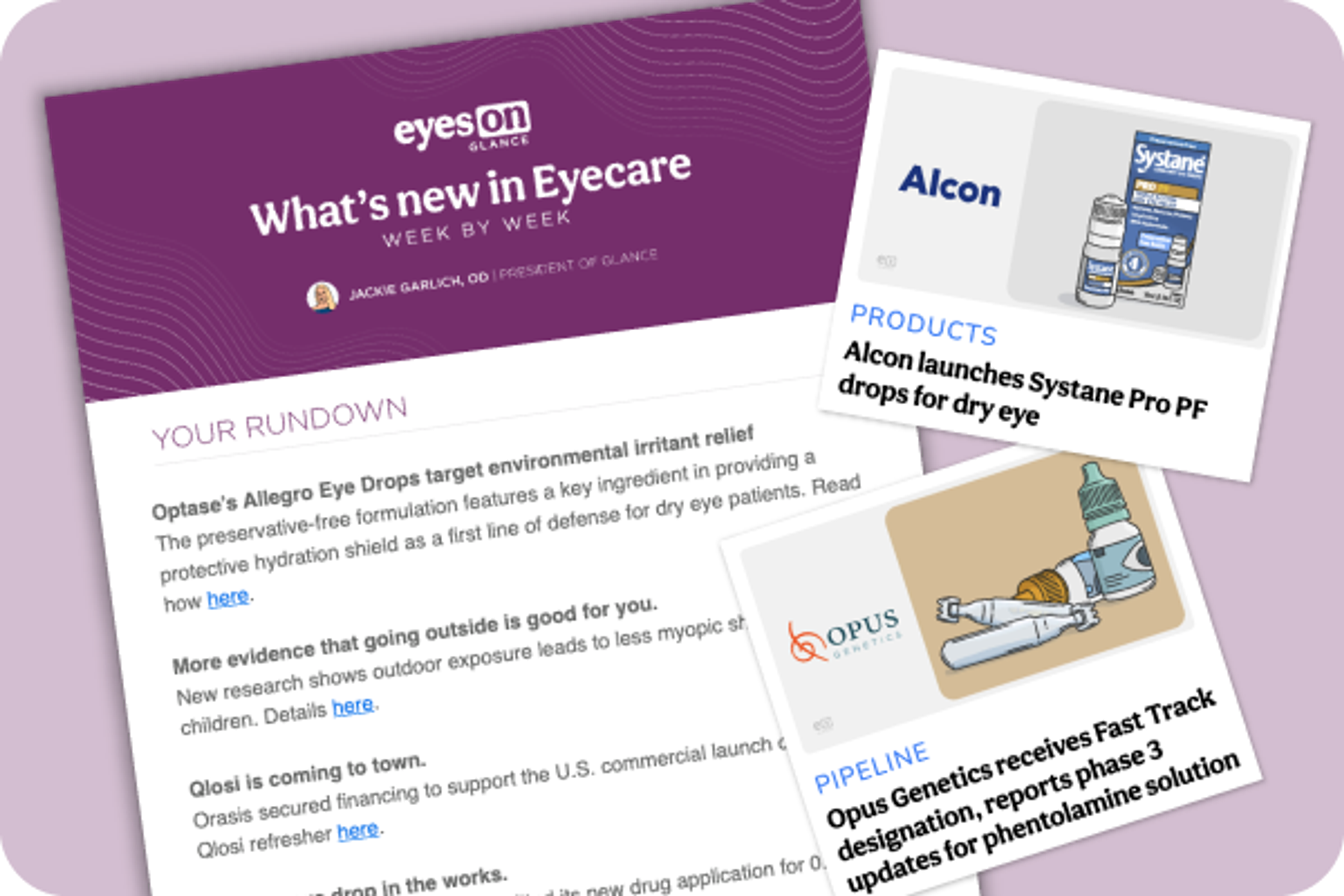 Glance by Eyes On Eyecare delivers concise updates on the latest in optometry and ophthalmology to your inbox. Curated by renowned dry eye specialist Jackie Garlich, OD, FAAO, our weekly digest keeps you informed on breakthrough therapeutics, clinical trials, and new protocols. Subscribe for a swift overview that keeps you ahead of trends while fitting into your busy schedule.