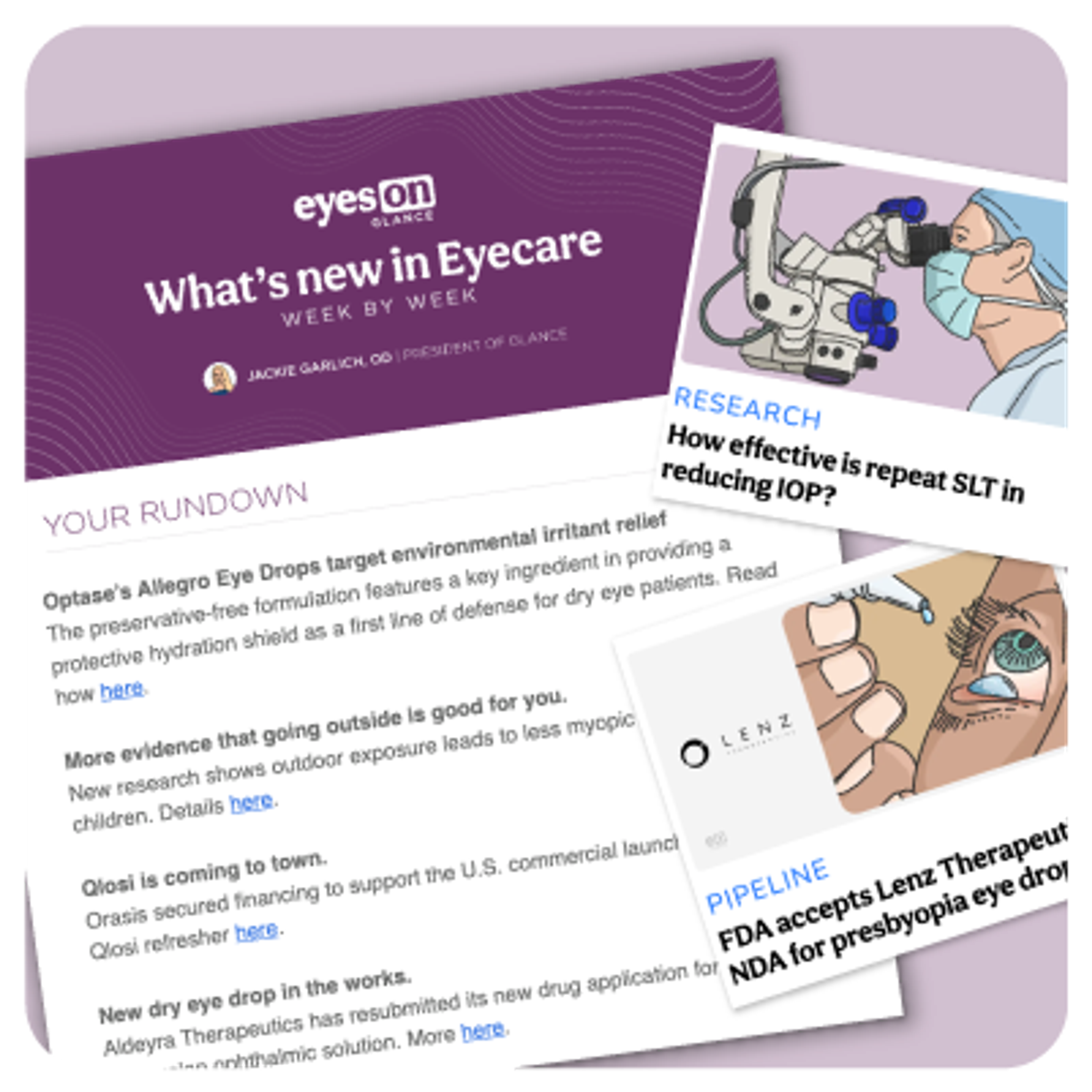 Glance by Eyes On Eyecare delivers concise updates on the latest in optometry and ophthalmology to your inbox. Curated by renowned dry eye specialist Jackie Garlich, OD, FAAO, our weekly digest keeps you informed on breakthrough therapeutics, clinical trials, and new protocols. Subscribe for a swift overview that keeps you ahead of trends while fitting into your busy schedule.