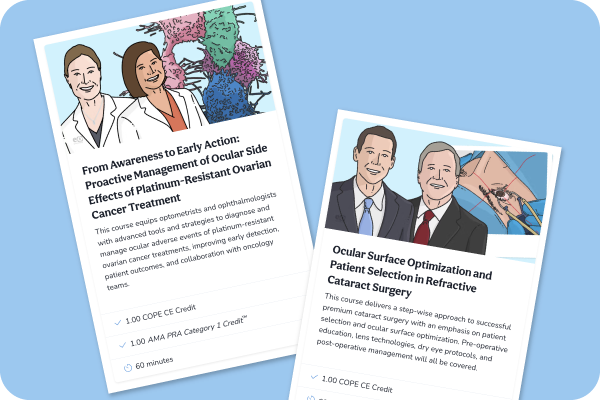 Stay ahead with Eyes On Eyecare Courses, concise, expert-led lessons designed for ambitious optometrists and ophthalmologists. Learn at your own pace with new topics released every month in both CE/CME and non-CE formats. From cutting-edge treatments to the latest clinical techniques, our courses give you the knowledge you need to stay at the forefront of patient care.